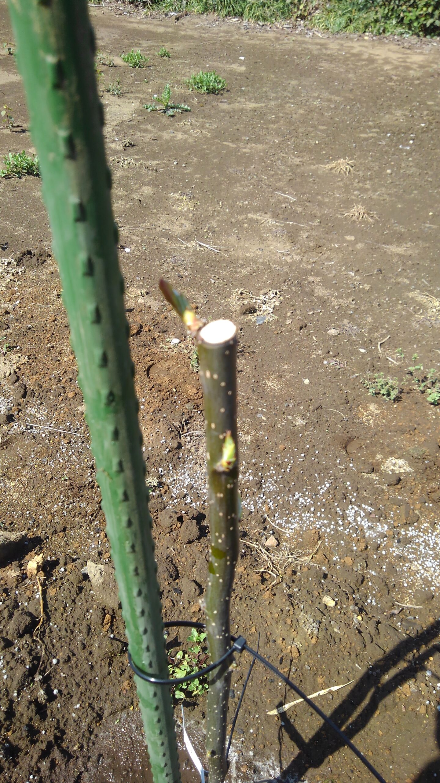 梨は購入した時に、一本の棒だったのでちょっと心配だっけど、芽が出始めてきた。