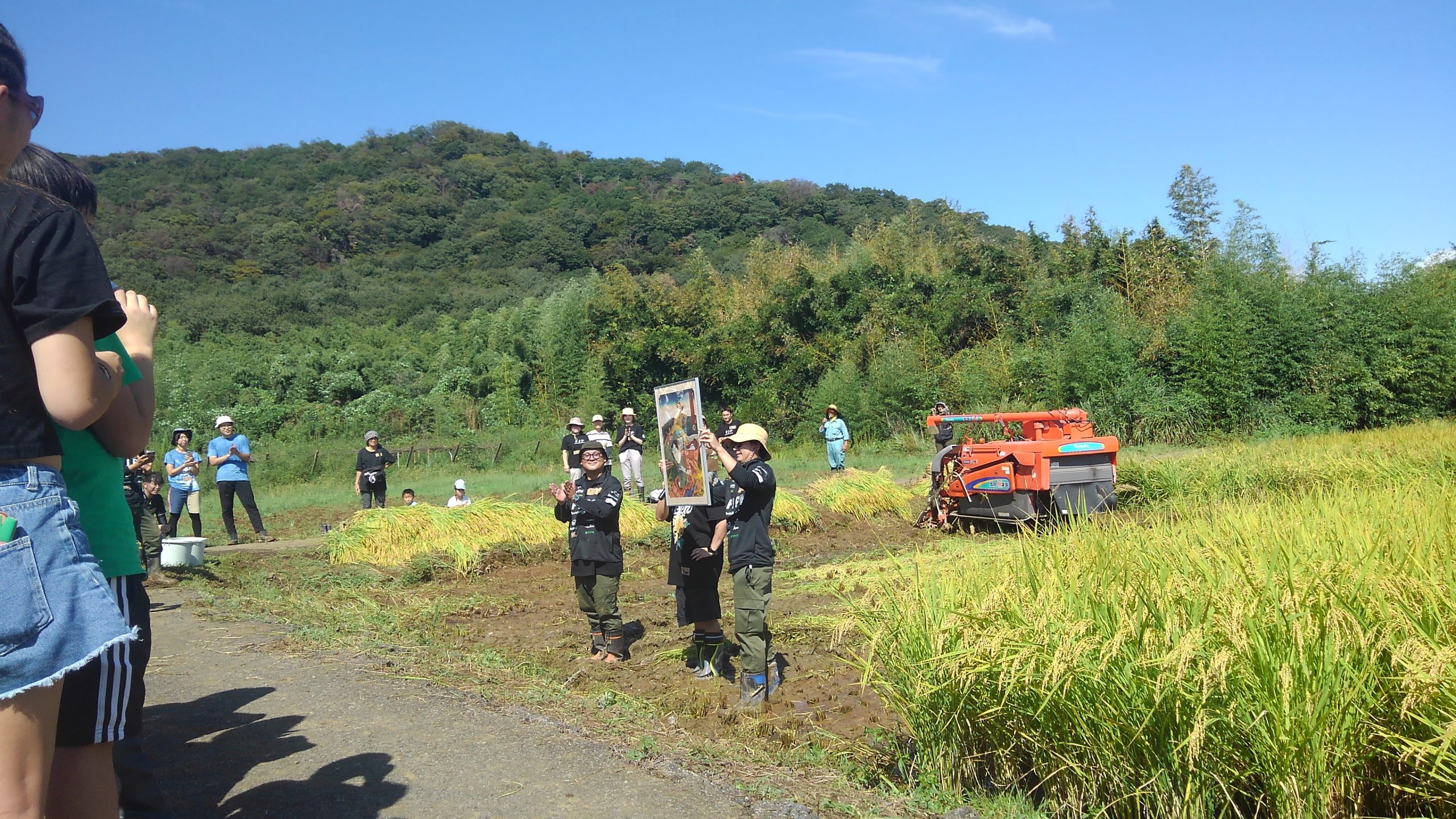 ある程度、稲刈りして完了。残りはコンバインで買っていた。ここで、ECサイトを10月から立ち上げると発表があり、今回浮世絵絵師の人に絵をかいてもらいTシャツを作ったそうだ。Tシャツやら、収穫した作物を売り出すそうだ。