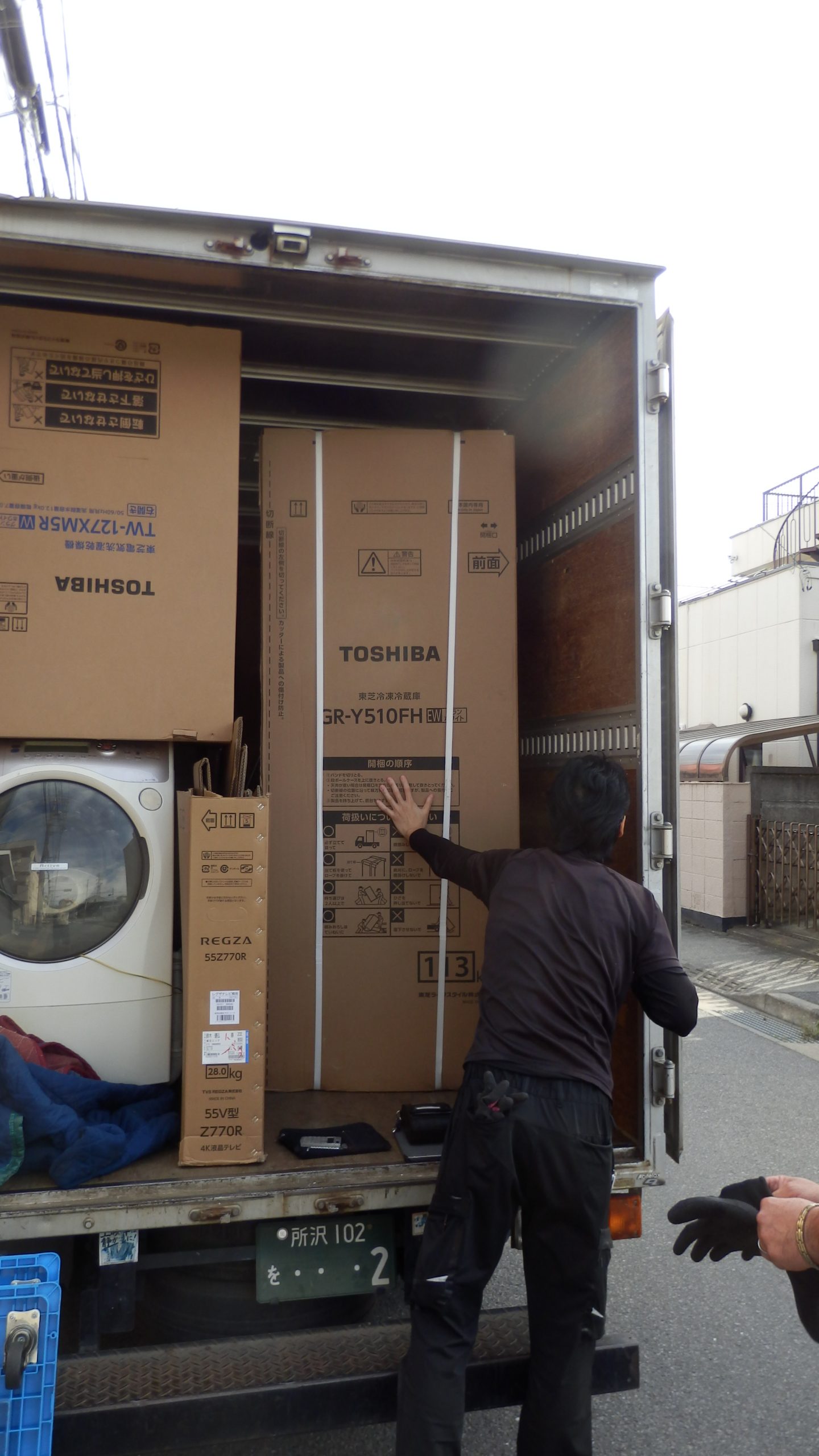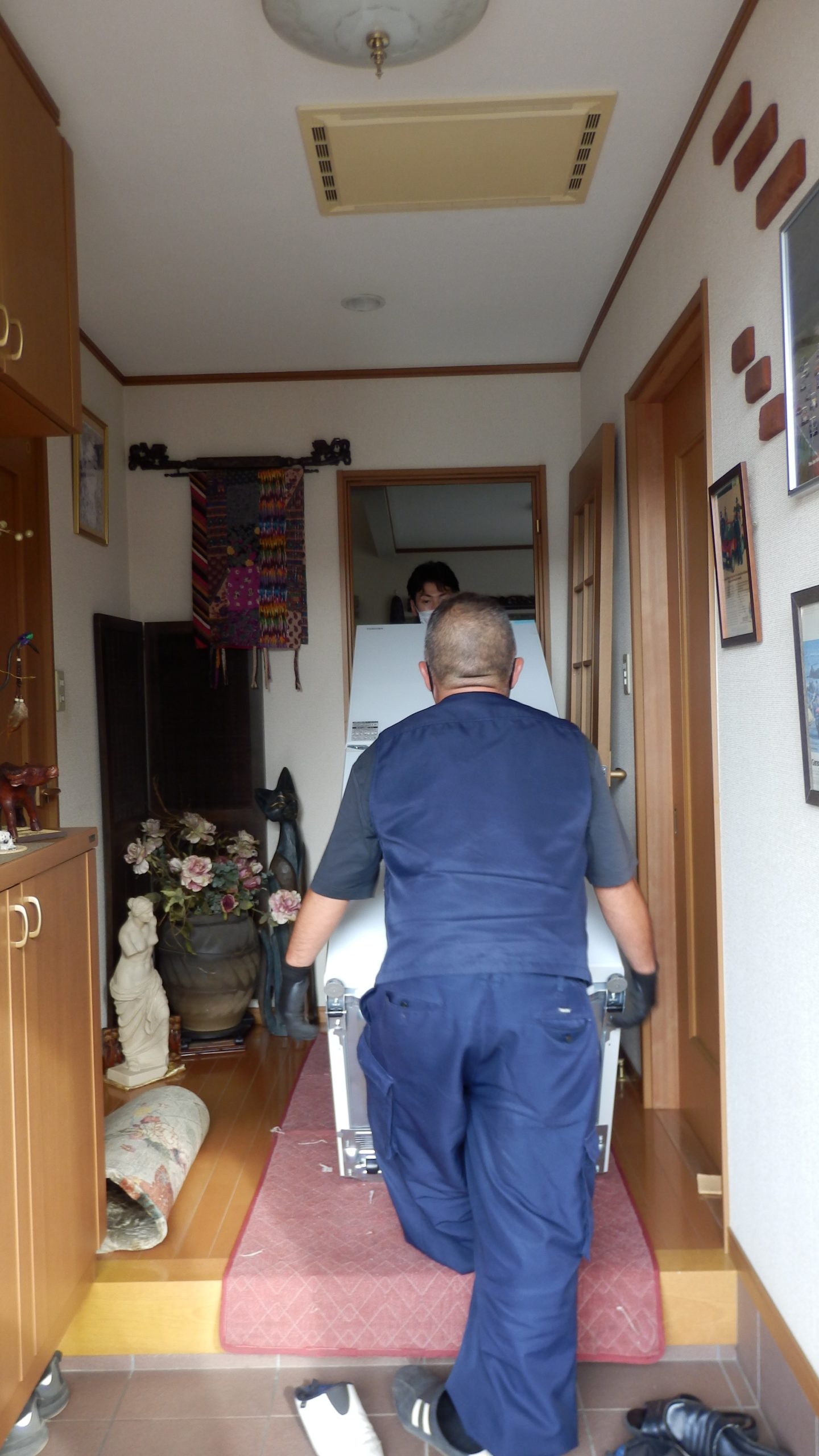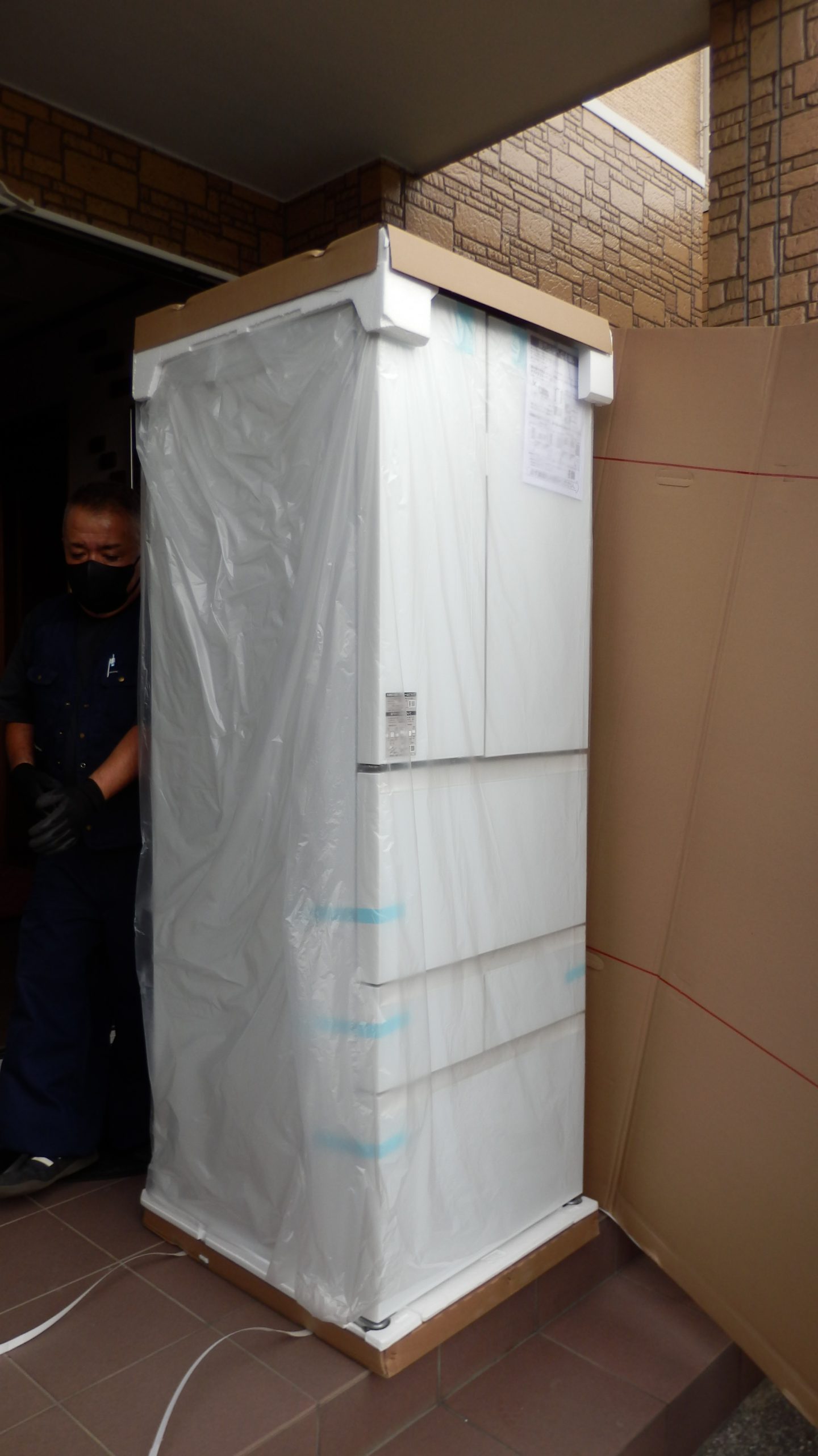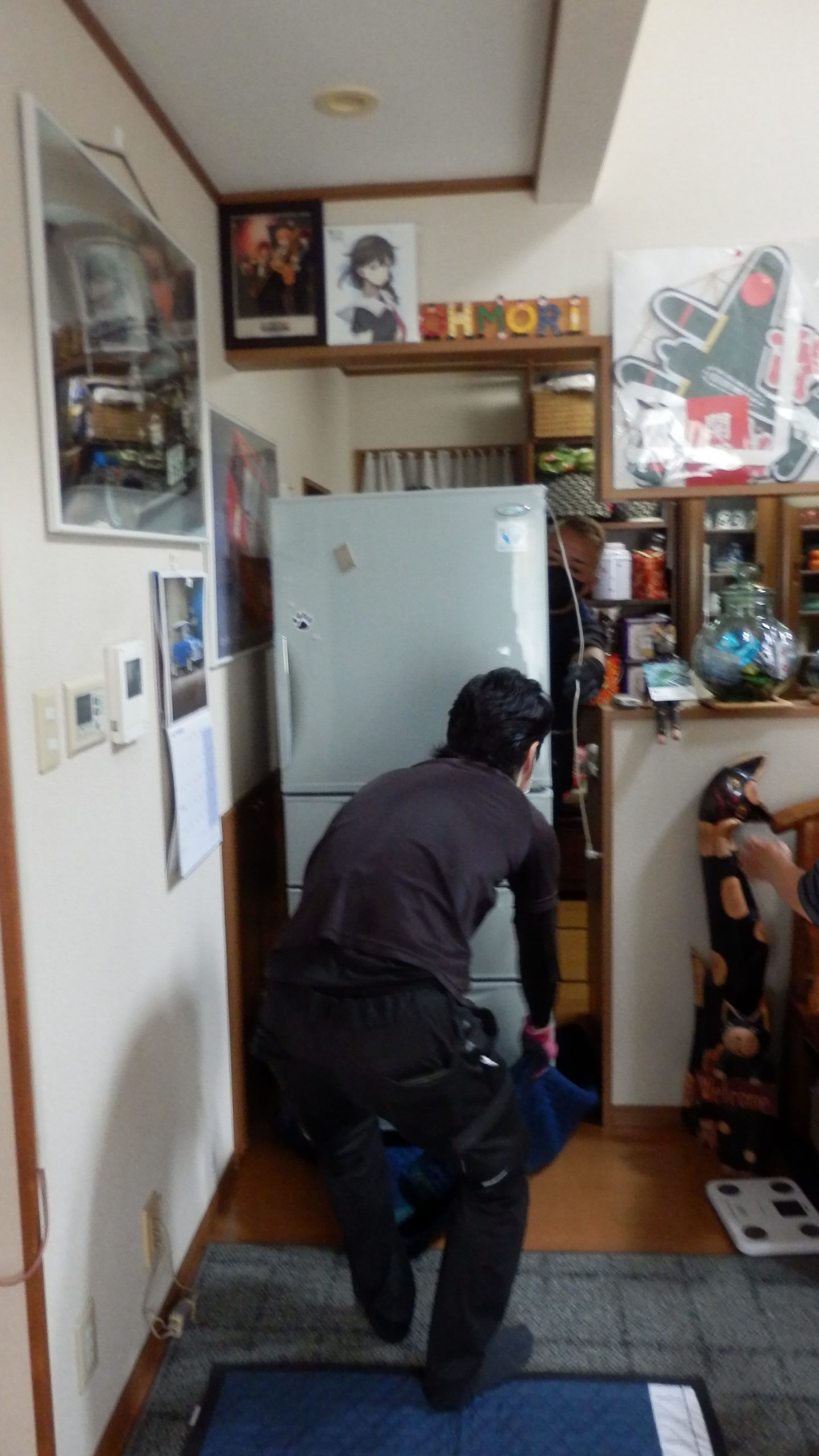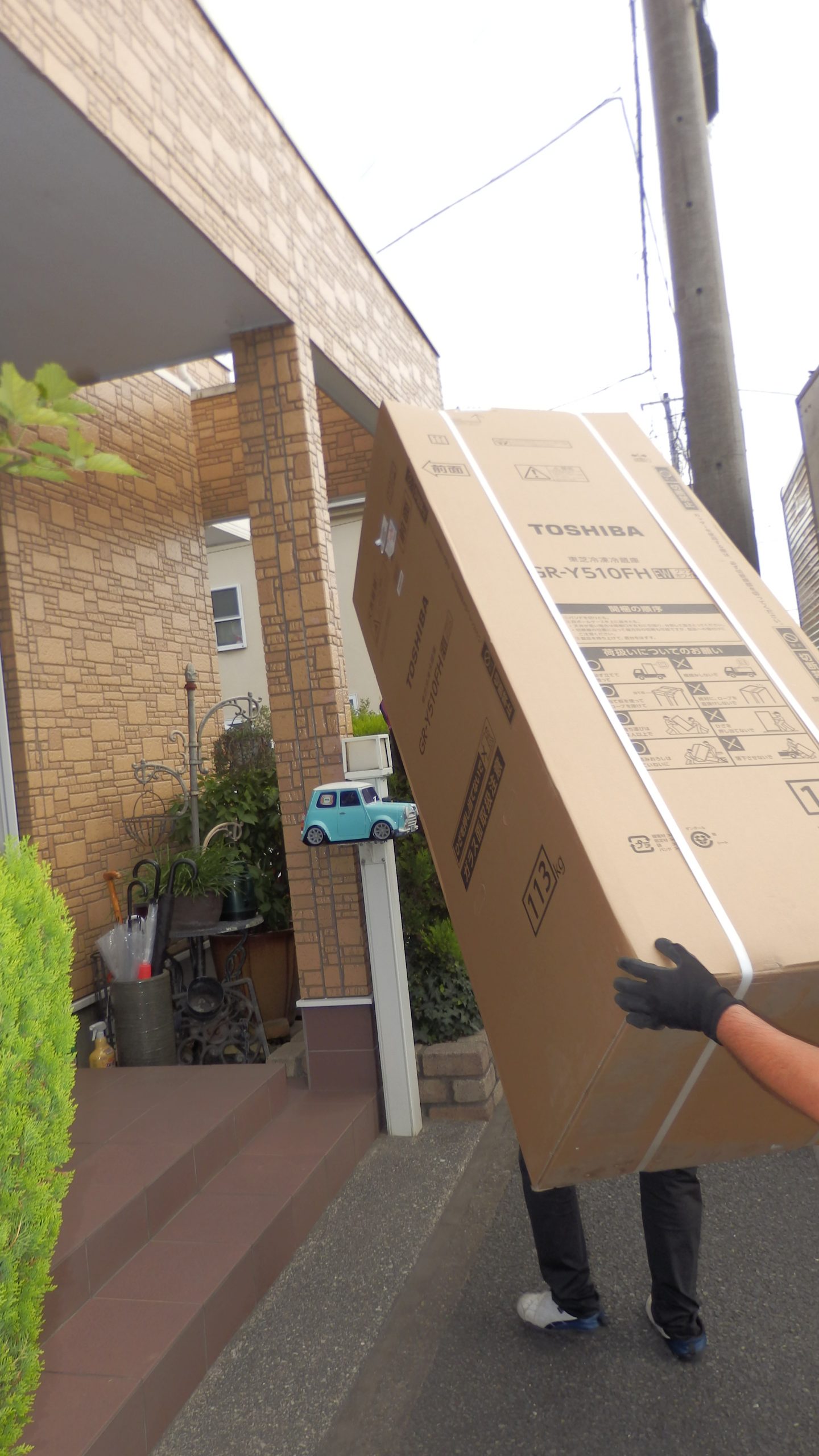 次に新しい冷蔵庫の搬入だけど箱に113kgって書いてあるけど、一人で上げてしまうとのこと。次は、アパートの2階にあげないといけないと言っていた。