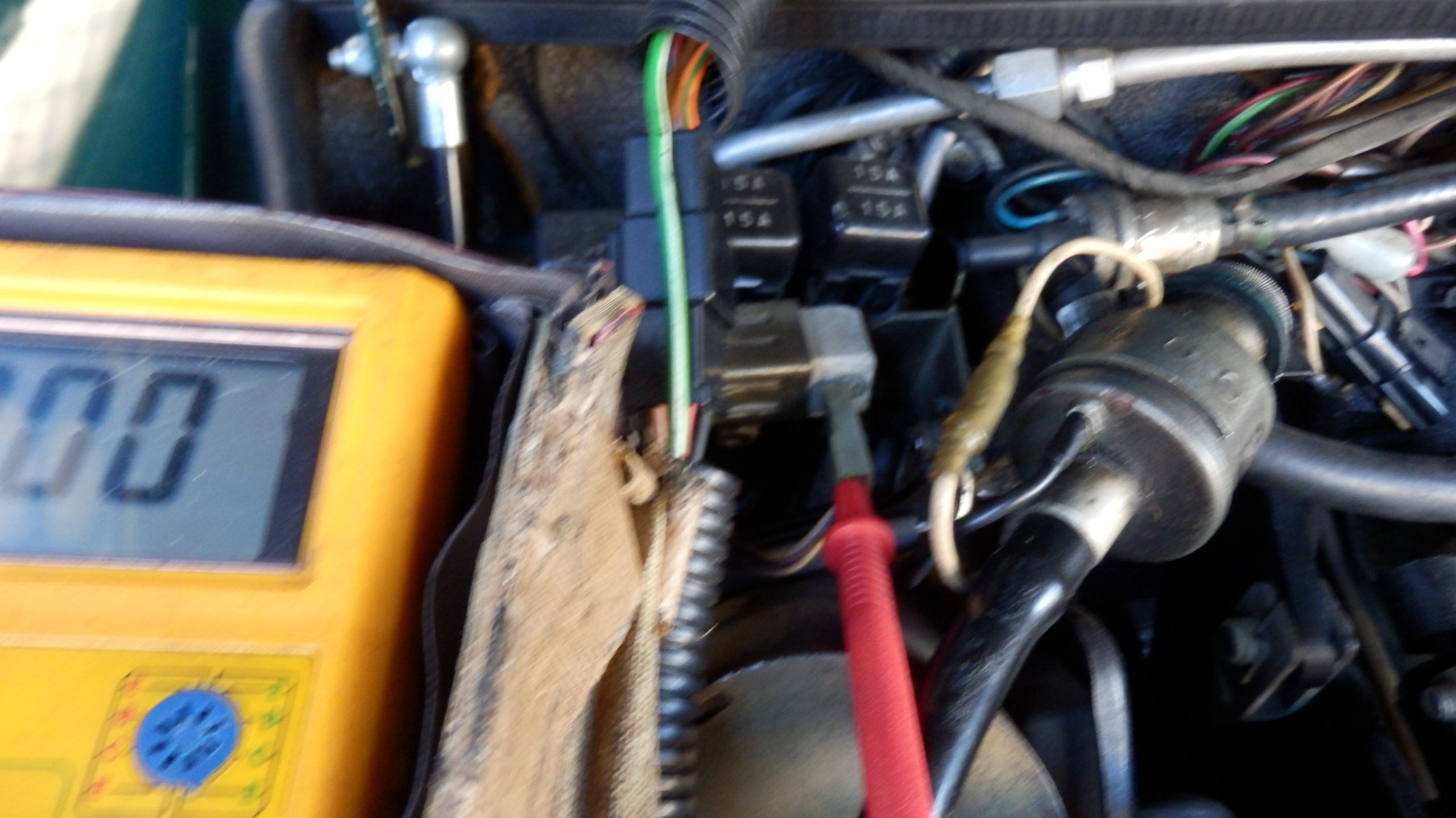 プラグコードを交換した後に、テストドライブでカインズの周りの買い物に行ったけど、またエンジンが掛からない問題が再発した。かなり、クランキングしても一回も初爆がなかった。今回はプラグを外してみたけど、全然濡れていない。また後ろに回って燃料ポンプに耳を当てても動いている気配がなかった。どうも秋川でロードサービスを呼んだ時と同じ状況だ。ただ、今回はしつこくクランキングしたら、燃料ポンプがうごいてくれたようで、エンジンが掛かったので帰ってこれた。燃料が来ないのは配線の問題なのかポンプの問題か切り分けるために、燃料ポンプへ送る抵抗の白紫のラインの電圧を計ってみると、ちゃんと電圧は出ているようだ。