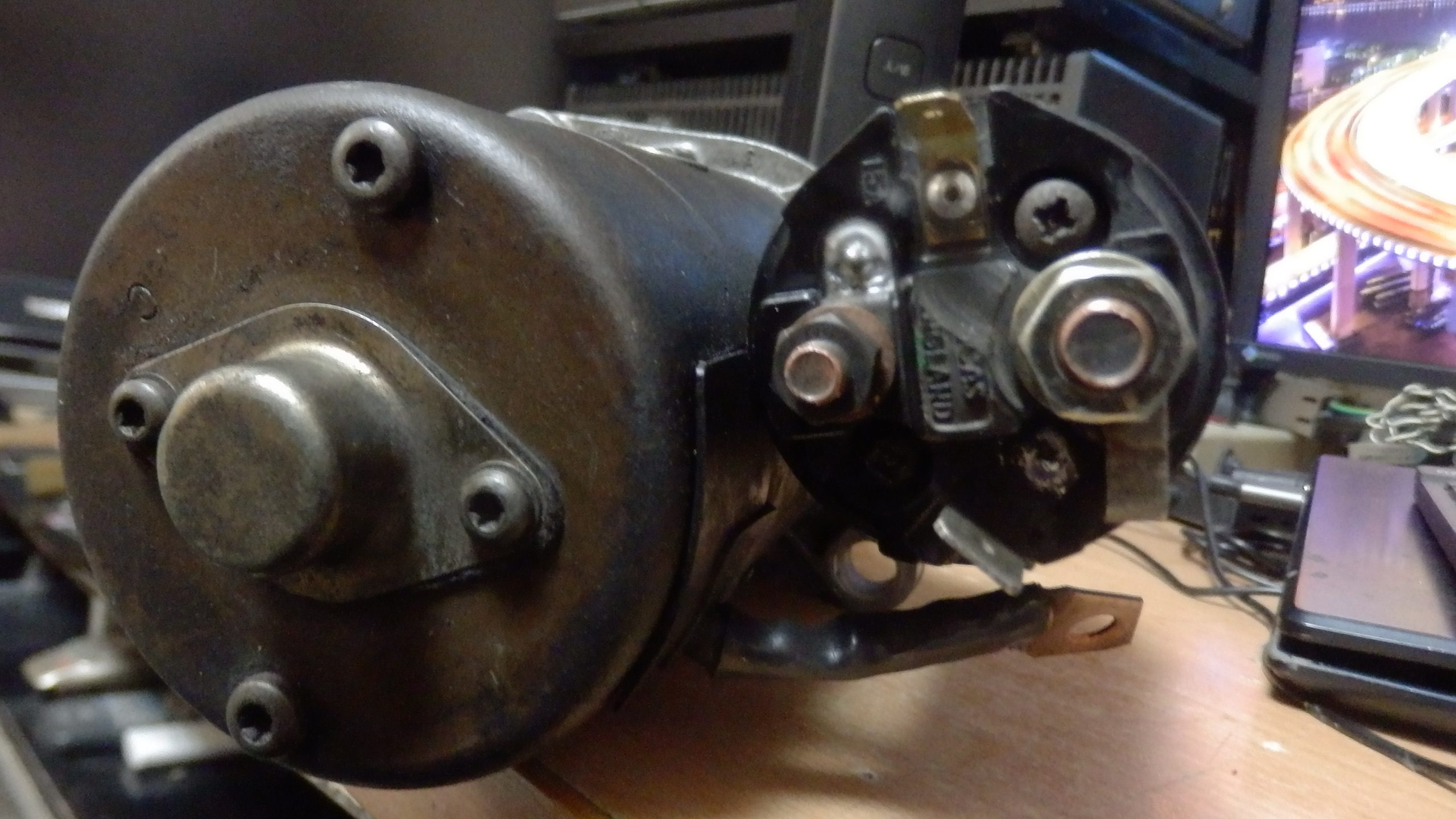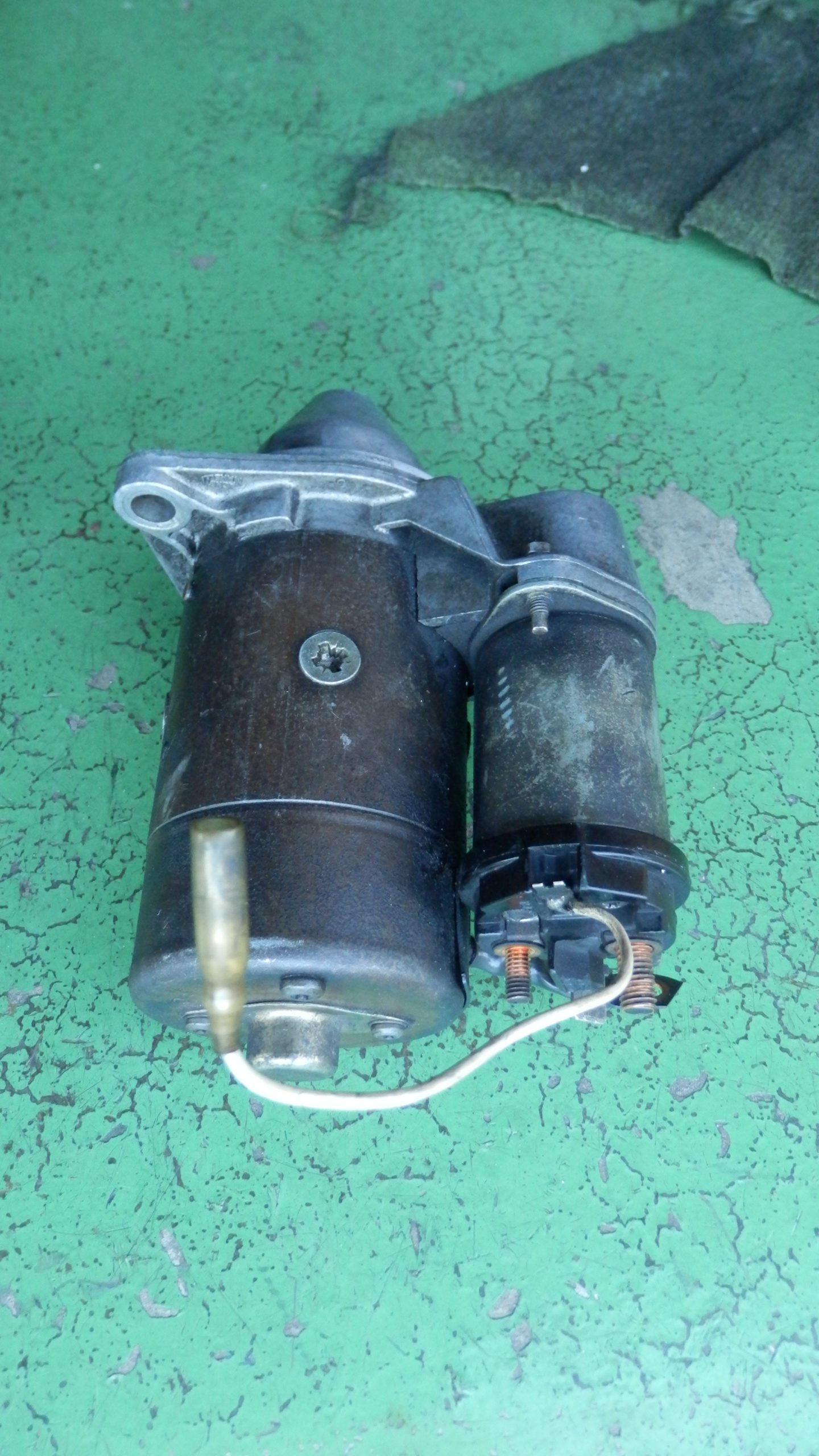 今売っているセルモーターは、燃料ポンプに行っている端子が使えないので、今回もともと付いていたセルモーターも使えるようにしたいと思った。今回の問題は、燃料ポンプに行っている端子のカシメが緩んでしまっているので端子を交換してカシメ直せばよいので今回やっている。下は、適当な対応で端子からリード線を足しているセルモーター。これをあるべき姿にする。