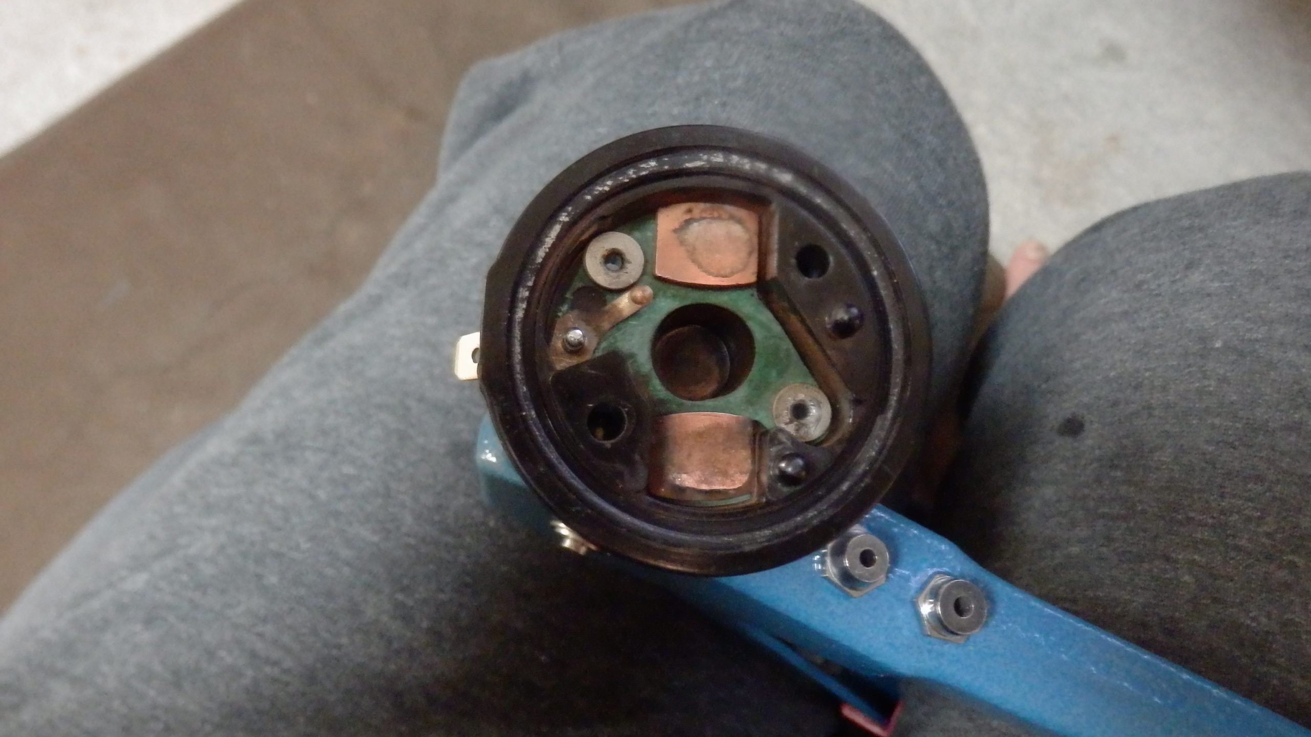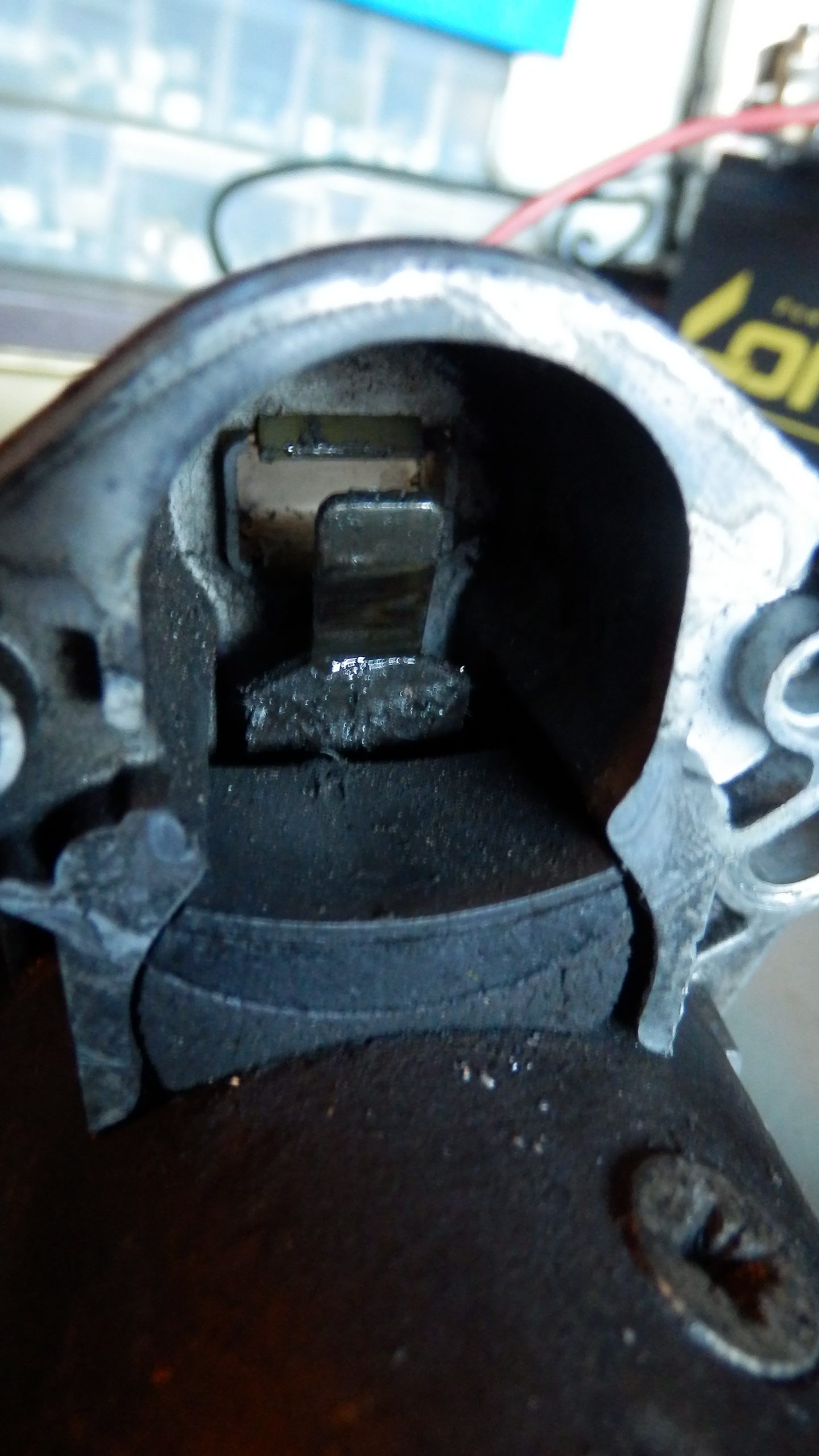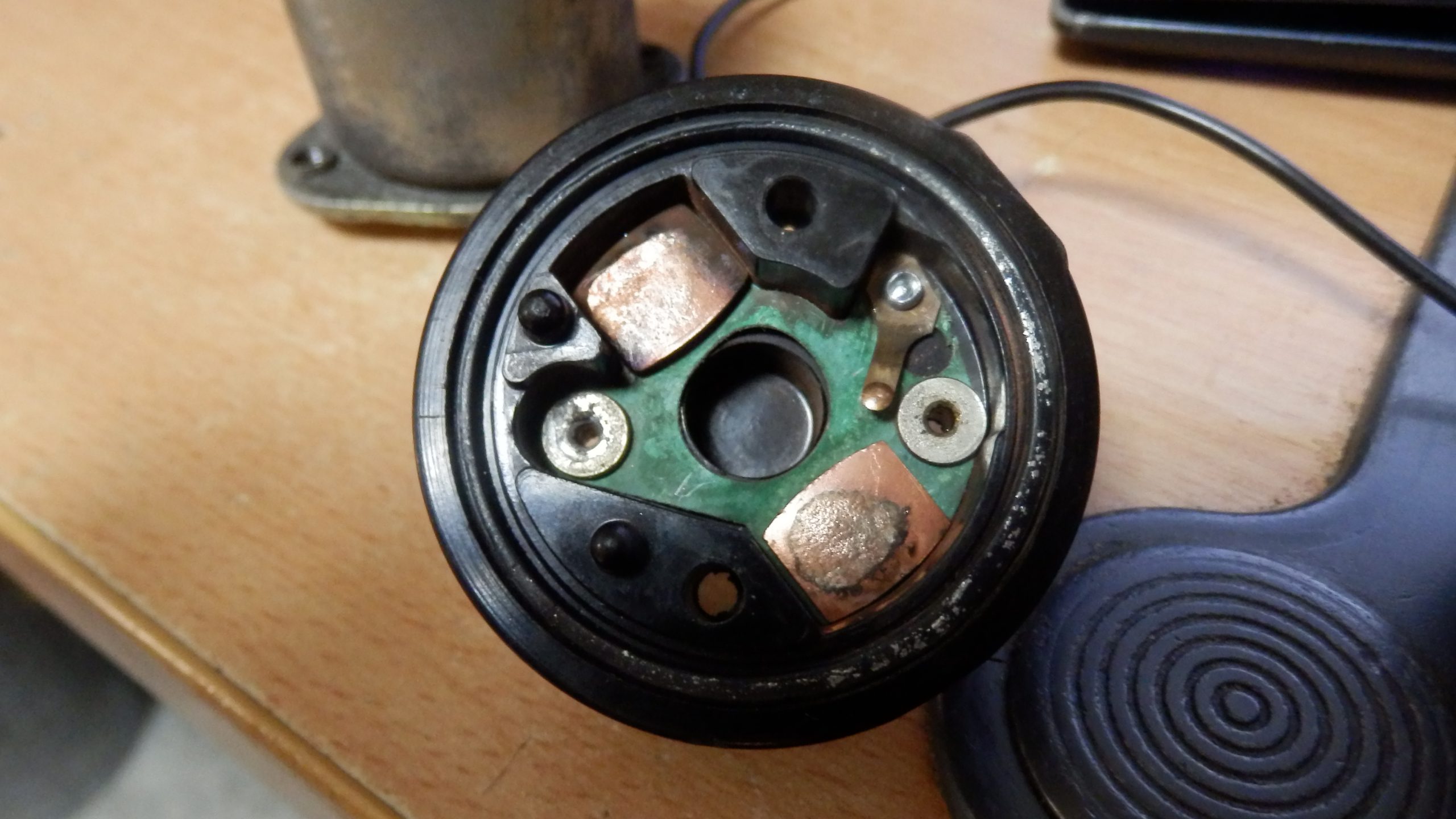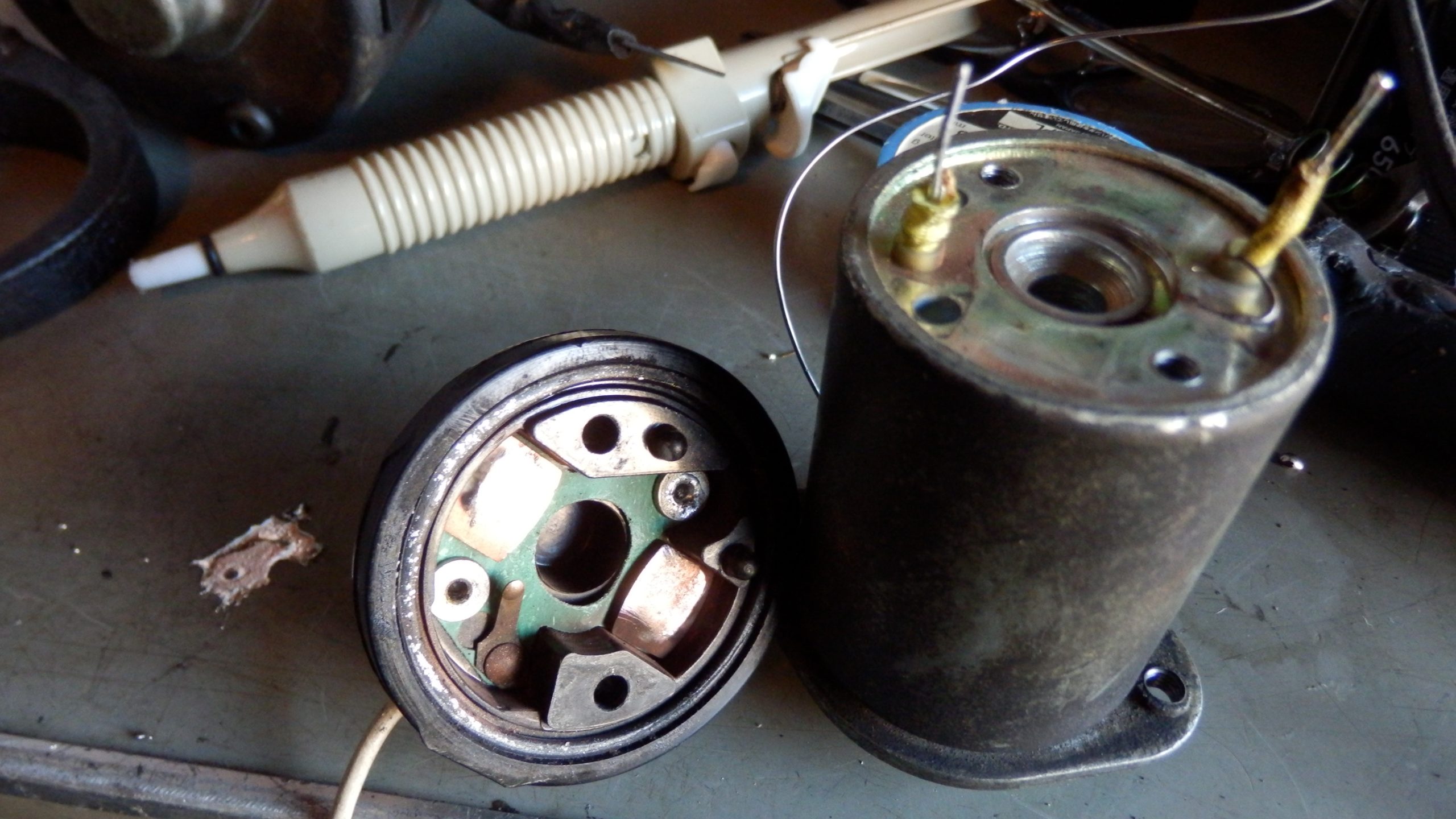 簡単にソレノイドの蓋が外れると思ったけど、ネジを外してもビクともしなかった。ソレノイドのコイルの半田付けされているので、これを溶かして外すことで蓋が外れる。