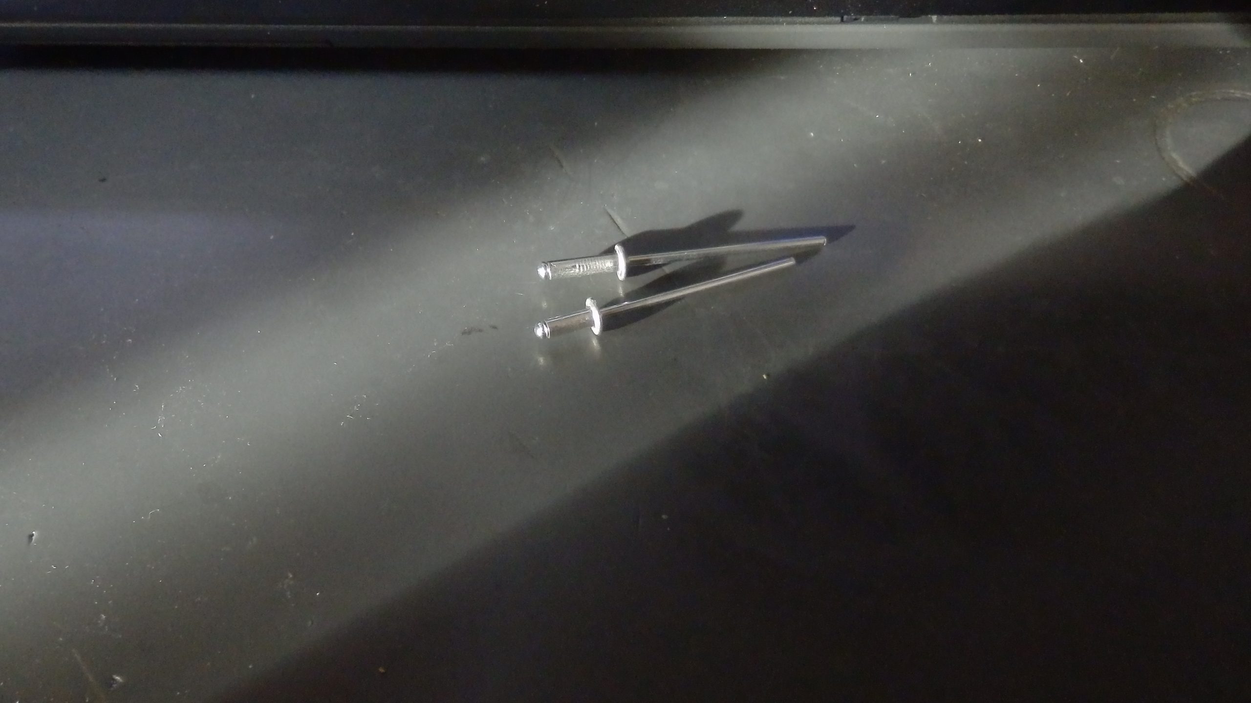 リベットを取ったのでカシメ直すために再度リベットをつけないといけない。穴径は、2.4mmだった。6mmでは短ったので、9mmのブラインドリベットを用意した。