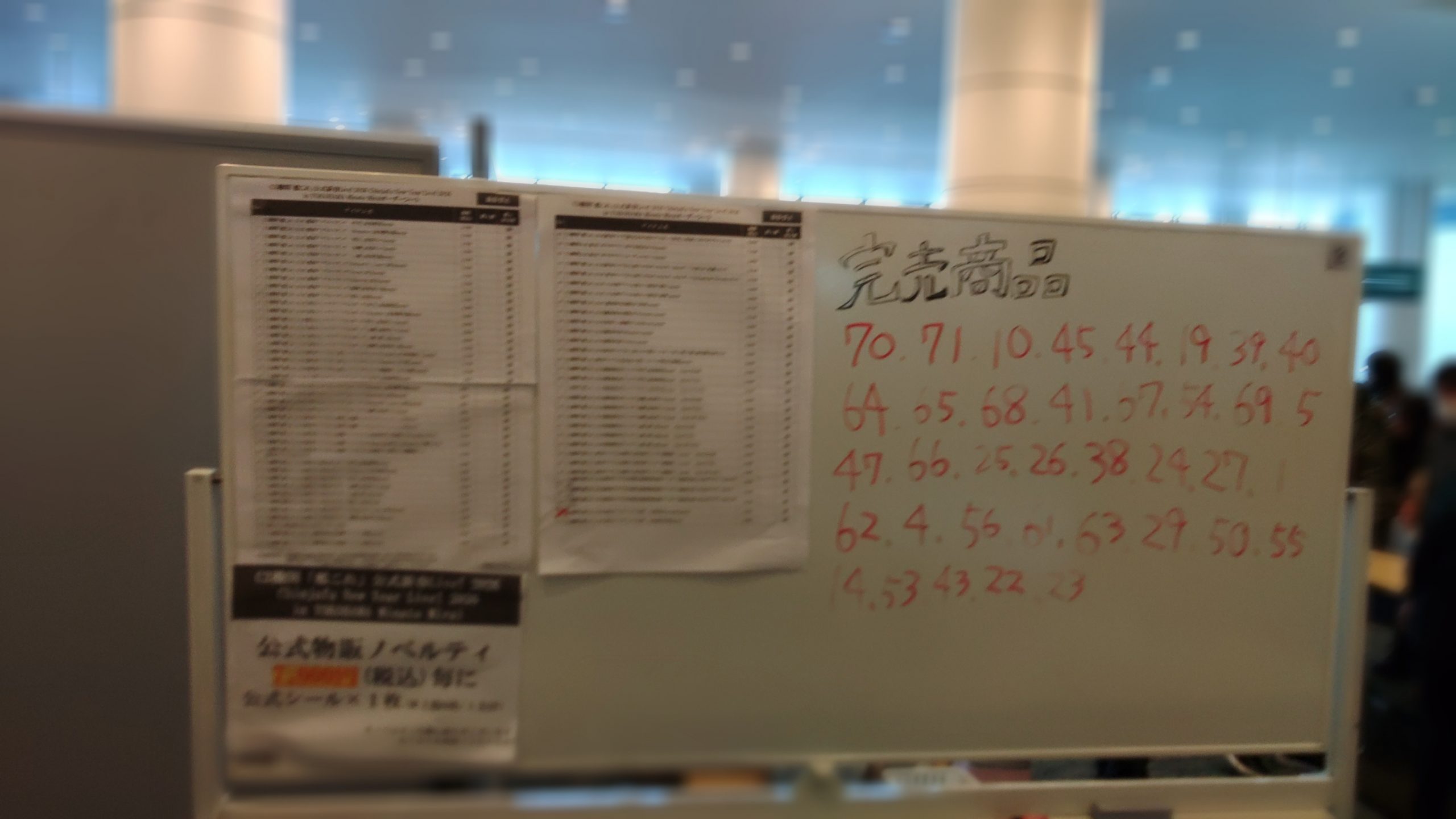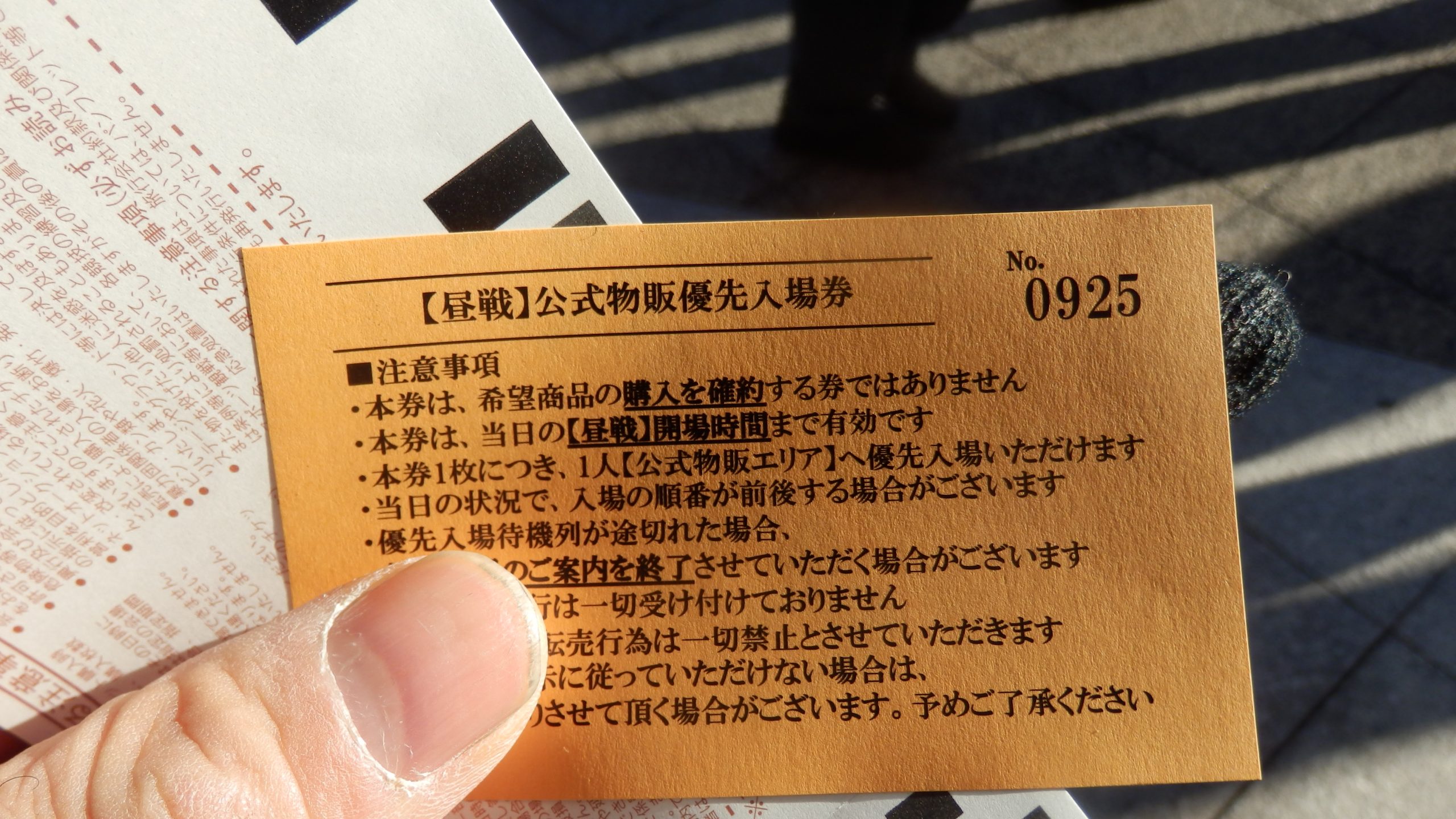 今回は運が悪く925番と後ろだったので物販はあきらめた。ちなみに整理券の最終番は1500代で呼ばれていた。