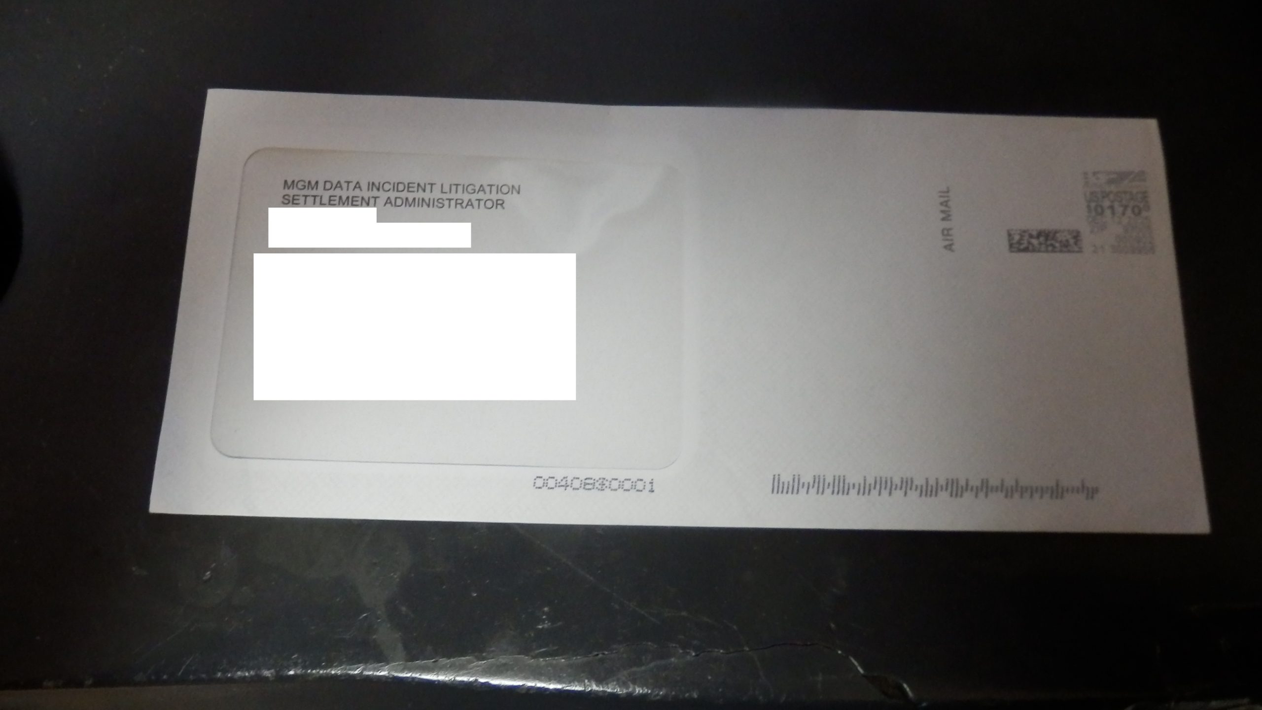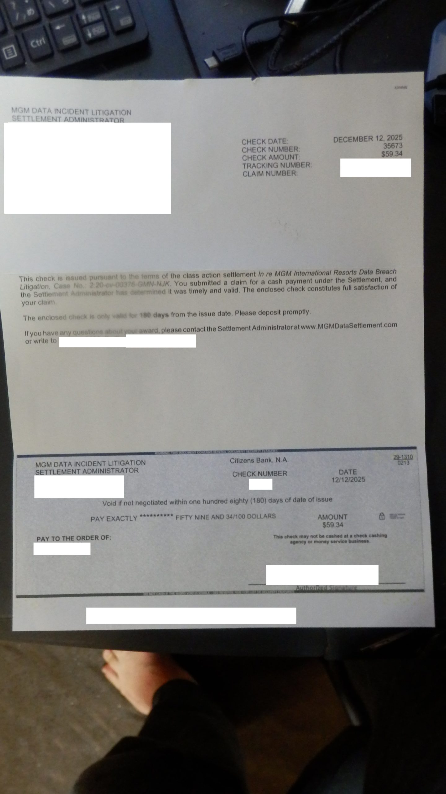 MGMの情報流出での集団訴訟の小切手が送らて来た。