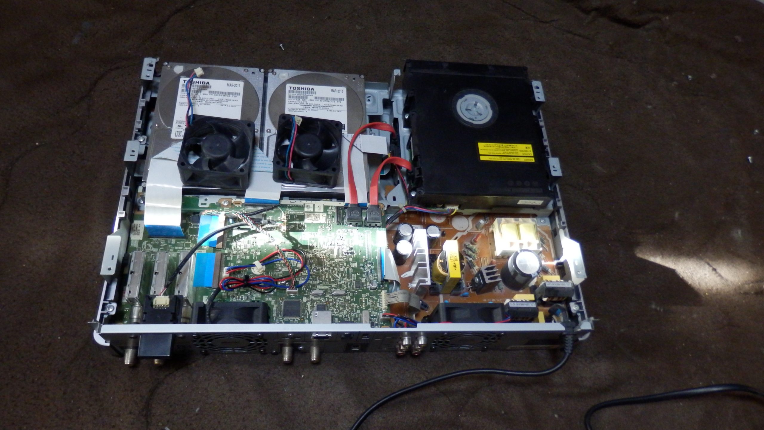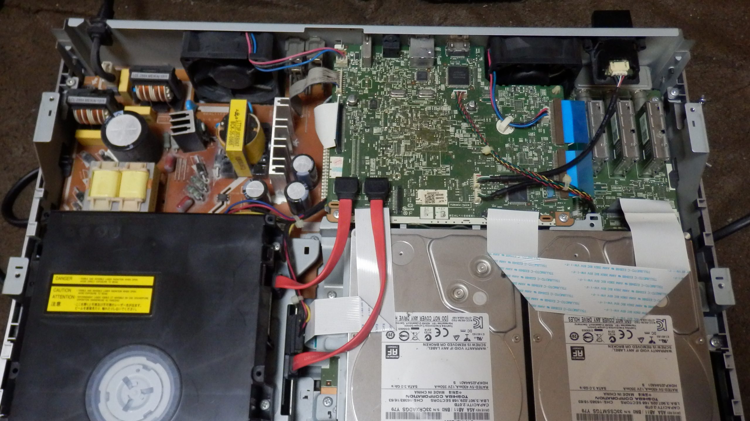 エアコンの取り付けをやっていて、全録のBDレコーダーが不調になった。動作確認をしてみると、なんか緑と赤ランプが点滅してしまっている。また、BDプレーヤーのトレイも開かないことが分かった。これは修理しないとねえと思って開けてみることにした。