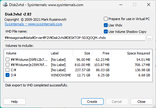 Windows11のPCでDisk2VHDでOS部のデータの吸い上げを実施した。