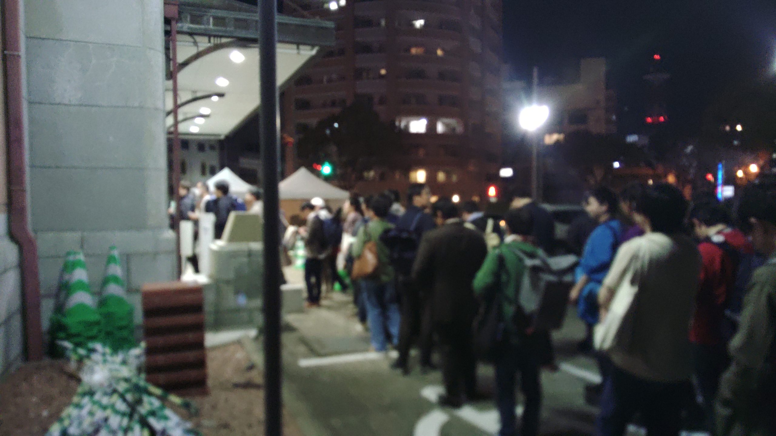 19:28に着いたのでぎりぎりと思ったけどまだ入場列が伸びていた。どうやら2つのトラブルが発生していた。一つは、チケットの番号と座席の指定番号が一致していなくて、どこに座っていいかのかわからない状態になっていた。もう一つは、前夜祭限定シールが足りなくなってしまった。前夜祭限定シールは後日取りに行くことになり、この情報取りに時間がかかっていた。
