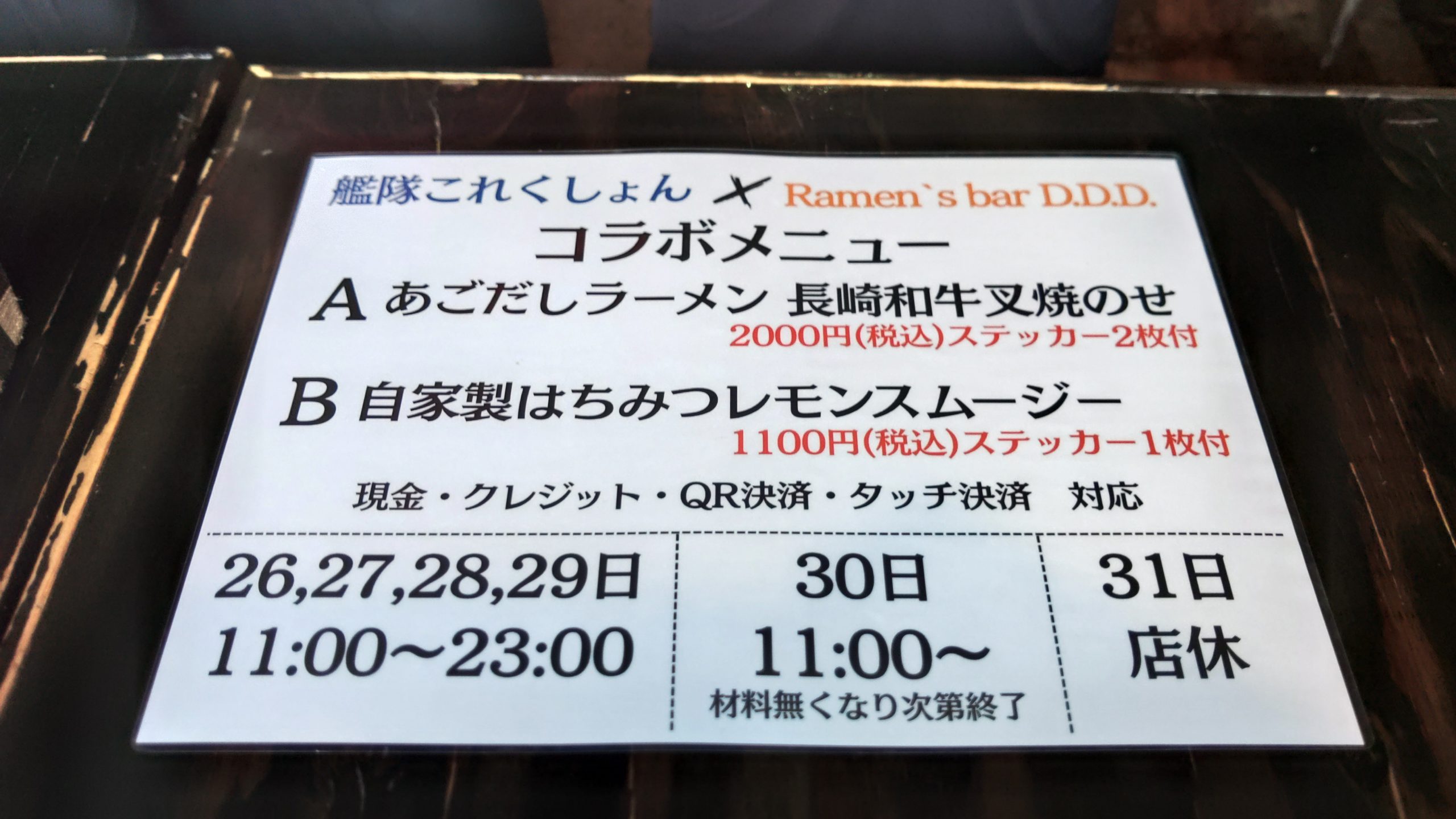 艦これのイベントの楽しみは、コラボ店舗。前はバッチはもらえたりしたけど、今はコラボステッカーをくばっていたりする。今回は、16店舗参加している。意外に佐世保中央駅近辺に集まっていて周りやすい感じがするけど、イナゴの提督が群がるのでなかなかまわるには戦略が必要だったりする。今回居酒屋さんが中心だったりするので、昼の営業が少なかったりするので、特定の店に集中しやすかったりする。あと、カレー機関Expressもあったけど、人気があるのはわかっていたので最初から行く気はなかった。